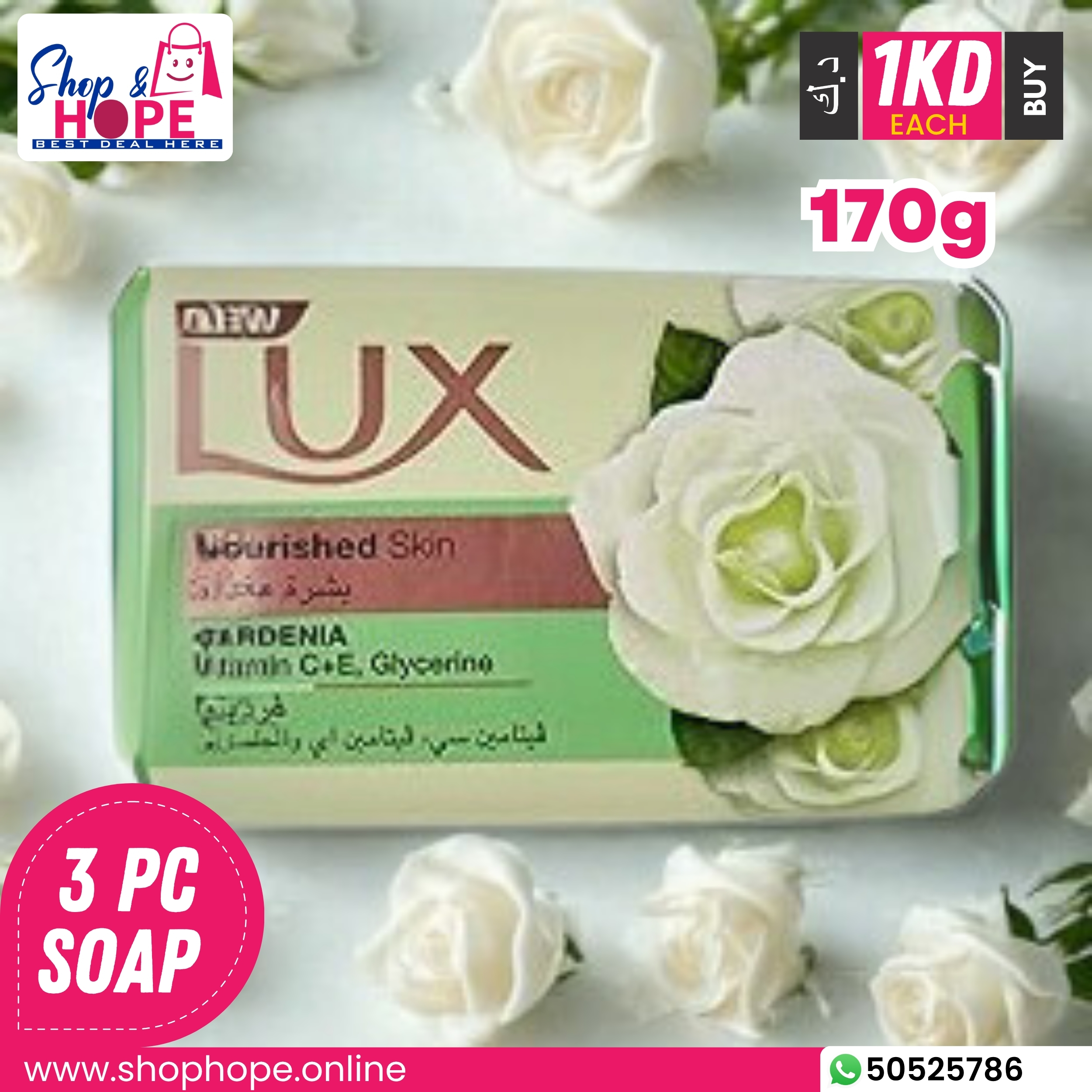 Lux Nourished Skin Gardenia Soap is enriched with gardenia extract, Vitamin C, Vitamin E, and glycerine. Its triple-action formula brightens, deeply hydrates, and reveals nourished, radiant skin. The creamy lather gently cleanses, while antioxidants repair dryness and support a healthy barrier. The luxurious gardenia fragrance refreshes the senses. Dermatologically tested, suitable for daily use on all skin types. Each pack contains 3 pieces of 170g.