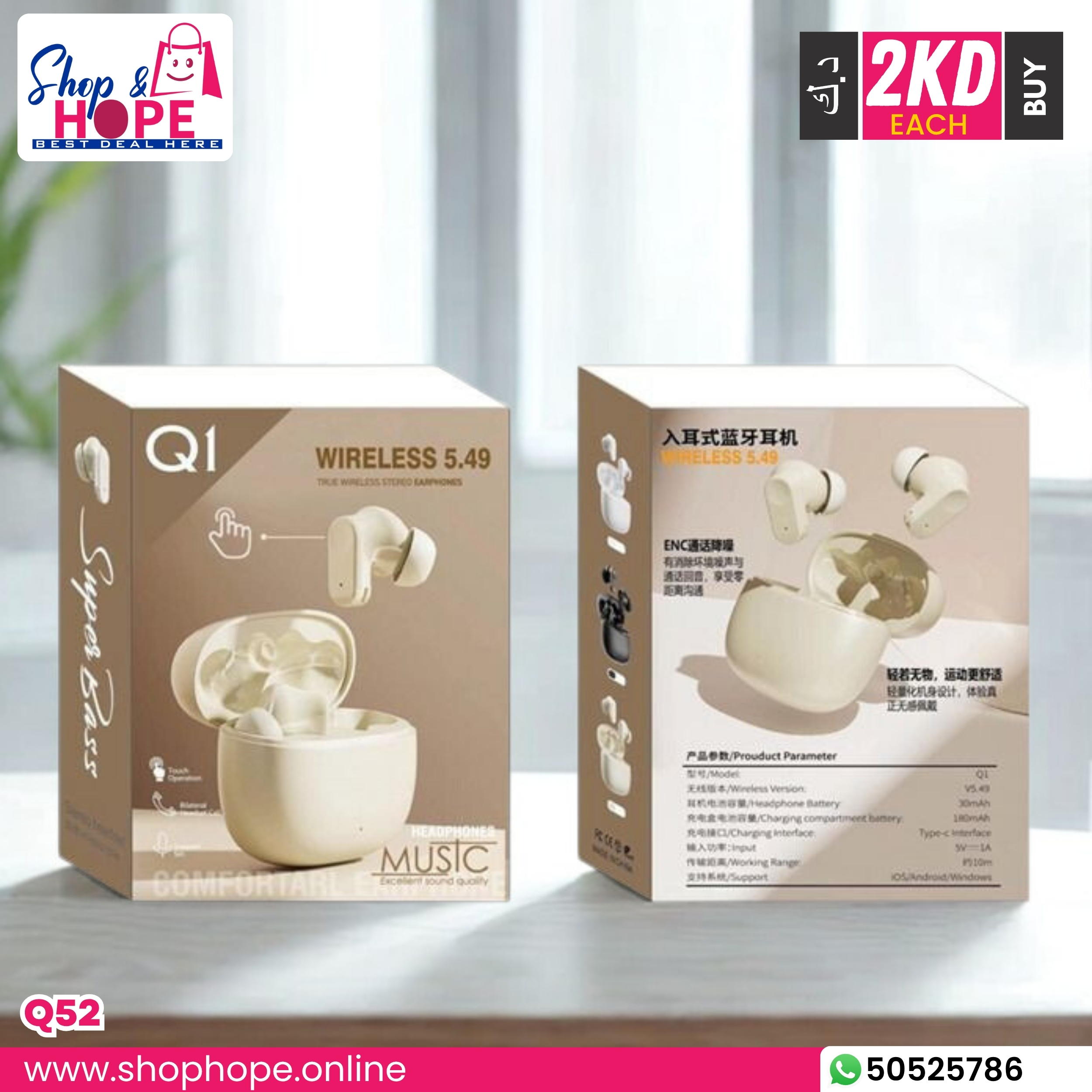 | Discover immersive sound with Q1 Wireless 5.49 TWS Earbuds featuring super bass, ENCall noise reduction, and modern touch controls. With Bluetooth 5.49 for quick, stable connections, these semi-in-ear buds provide a comfortable fit and HD music for every lifestyle. Each charge delivers up to 4 hours of play, with 24+ hours from the portable charging case. The smooth-surface case is compact and pocket-friendly. Enjoy single/twin use, voice assistant support, LED battery indicator, and sweat-resistant (IPX4) build for sports or travel. Keywords: Q1 TWS earbuds, wireless Bluetooth 5.49, super bass, ENC, touch control, beige earphones. |