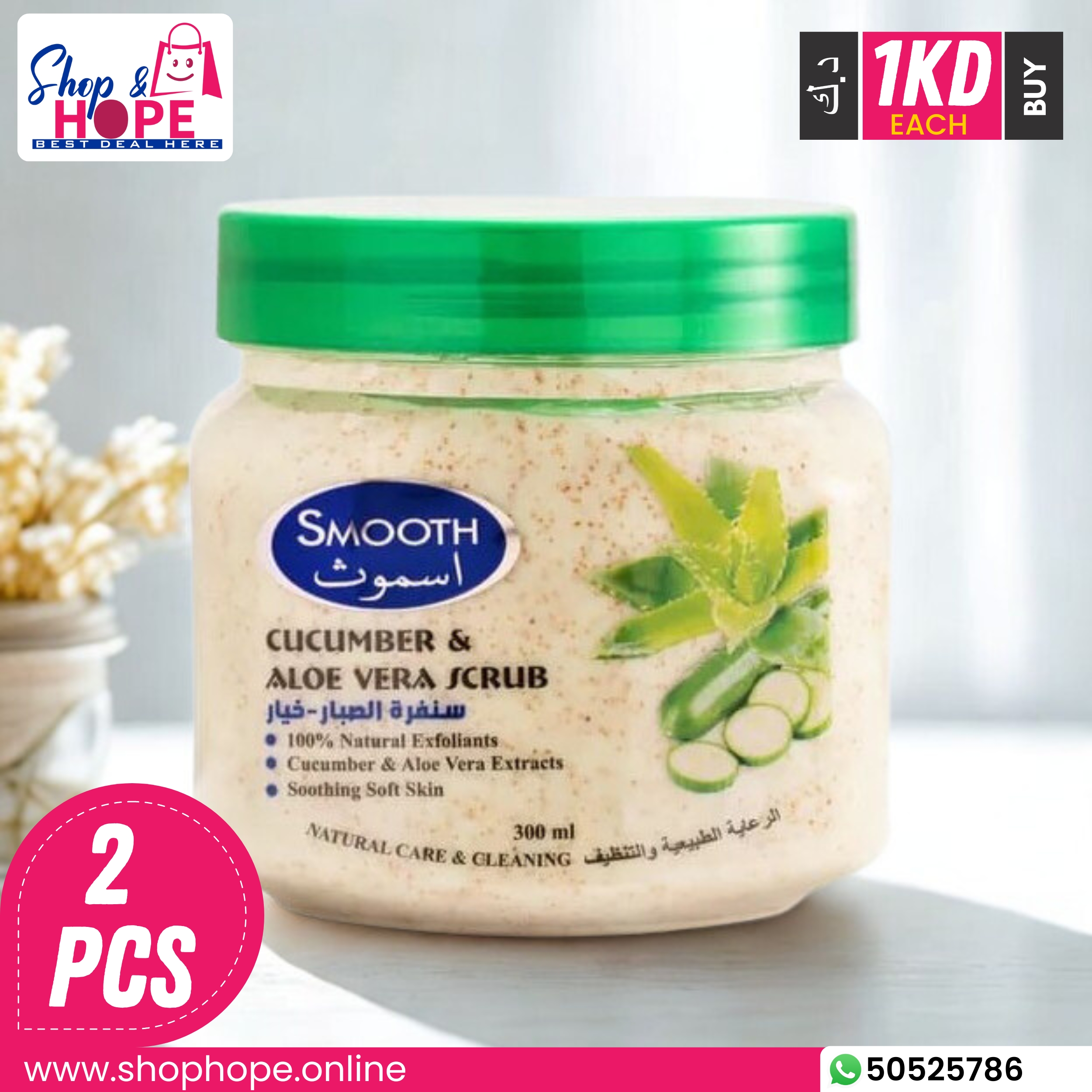 Refresh and soothe your skin with Smooth Cucumber & Aloe Vera Scrub Cream. This hydrating exfoliant blends cucumber and aloe vera extracts with 100% natural exfoliants to gently polish away dead skin cells, dirt, and excess oil. Cucumber delivers a cooling effect, reducing puffiness and restoring a healthy glow, while aloe vera deeply hydrates, calms irritation, and strengthens the skin barrier. Regular use on face and body unclogs pores, reduces tan and blemishes, and leaves skin soft, supple, and radiant. Suitable for all skin types, especially sensitive skin.